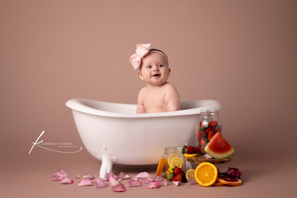 One of the highlights was the fruit bath scene. Vibrant citrus slices and fresh berries added a fun pop of color while she splashed happily in the mini tub. These fun themed setups make milestone sessions truly unforgettable.